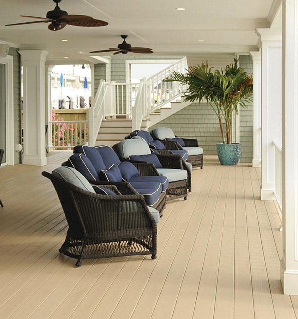 Made of high-performance and recycled polymers (and absolutely no wood fibers), our TimberTech Advanced PVC decking is highly resistant to moisture damage like mold and mildew, and it won’t splinter, crack, warp, peel, or rot.