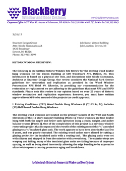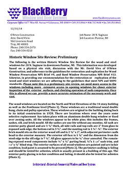 The first step BlackBerry takes to determine if a project in Michigan, Ohio or Indiana requires historic window restoration or window replication is visit the site and survey the condition of the existing window components. Our goal is to preserve the original windows as a first course of action. However, many projects are in such poor condition or have had the windows removed in prior years or renovations, that restoration is not possible. BlackBerry provides a written report called a Historic Window Site Review that details the existing conditions, recommended course of action, and budget pricing that the Owner or Architect can use as basis of review. This report includes a breakdown of window types, profiles, dimensions, quantity and square footage. Photos are included showing typical details and conditions of the windows and building. We provide various options to window restoration and window replacement so more than one direction for the work can be considered. This report has proven to be an effective tool when working with the NPS, SHPO, and local historic district commissions. BlackBerry has many available product options for the restoration or replication of all window material types including wood, steel, and aluminum.
